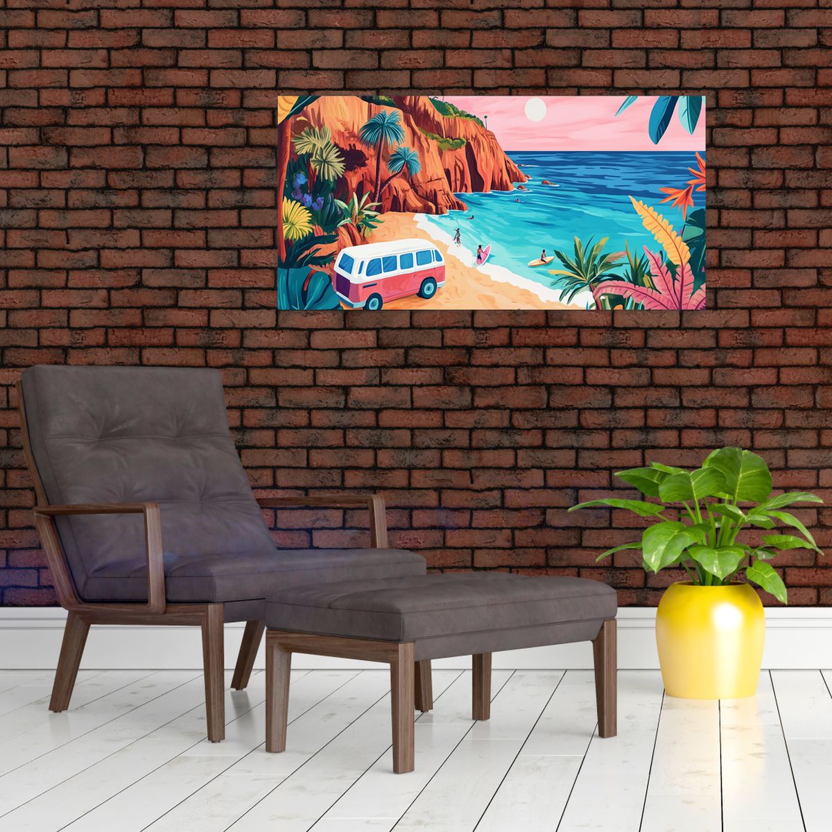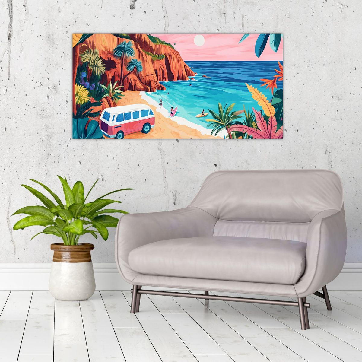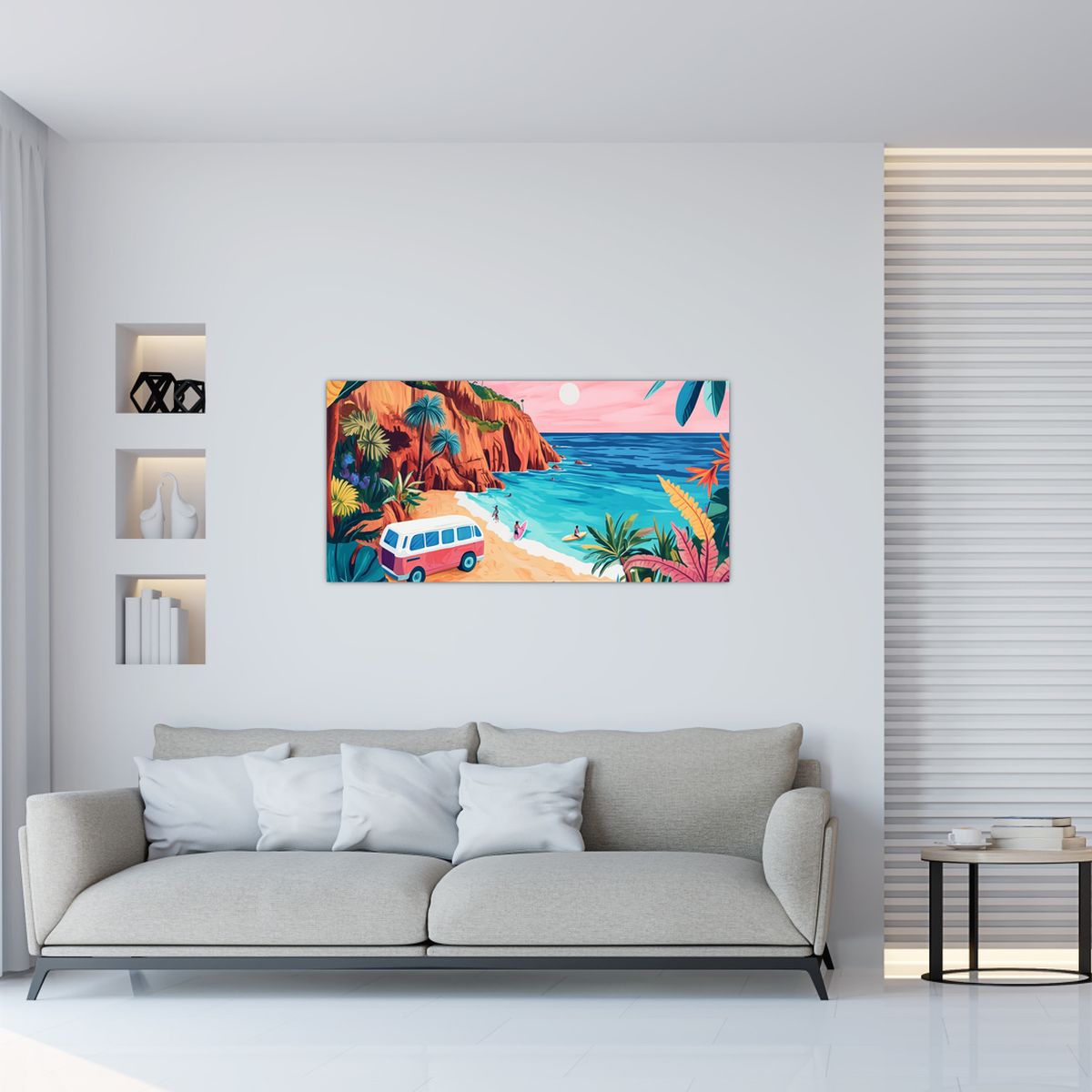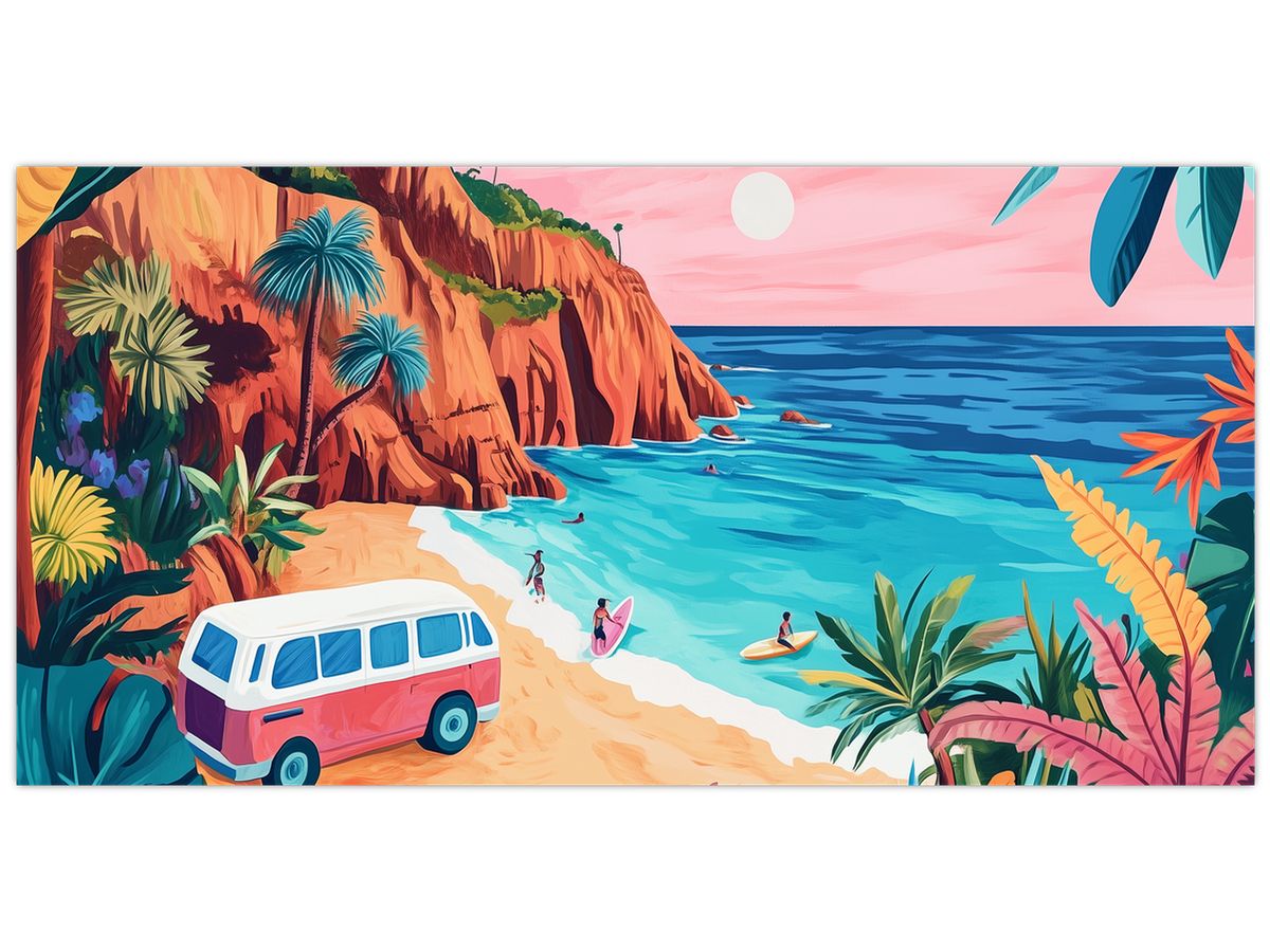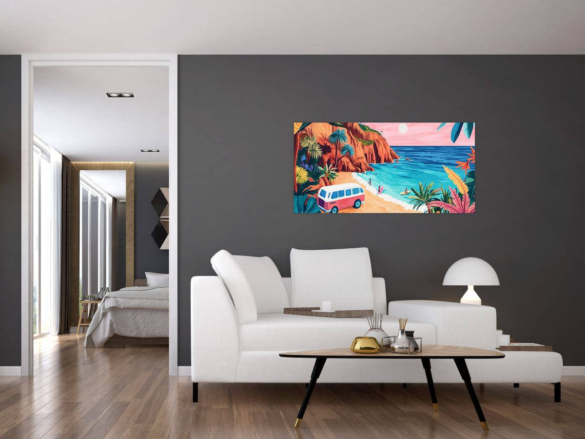 Glasschilderij - Caravan bij de oceaan