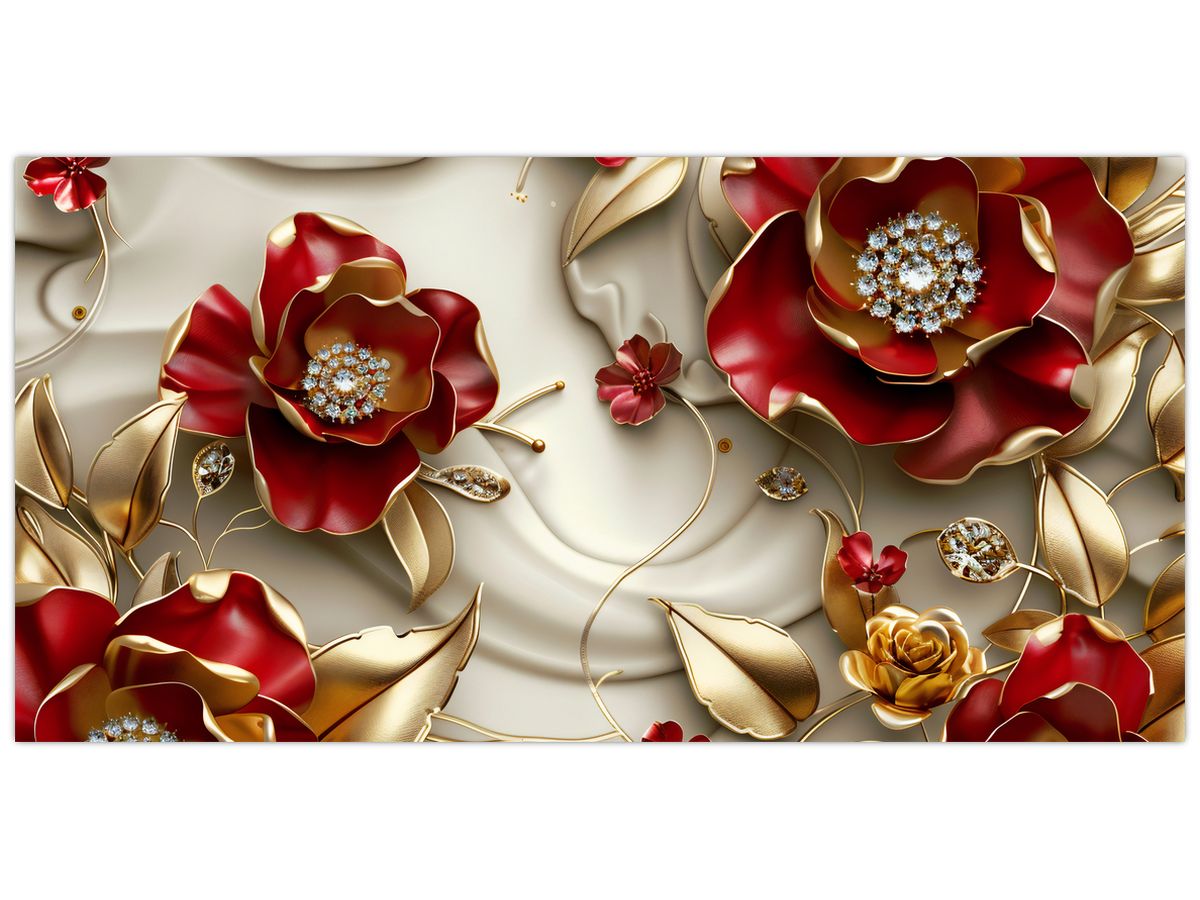 Schilderij - 3D rood-gouden bloemen