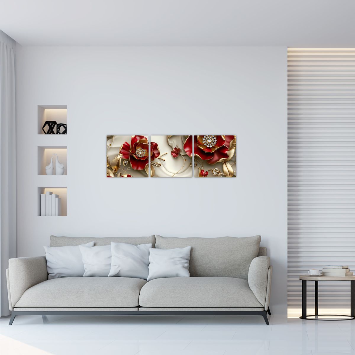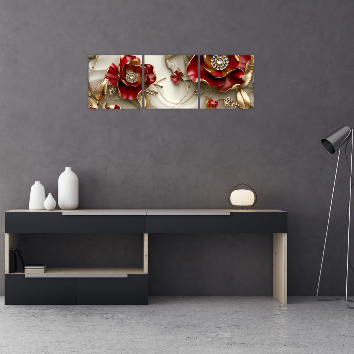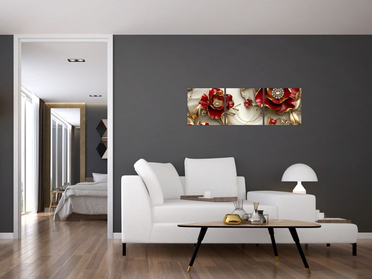 Schilderij - 3D rood-gouden bloemen