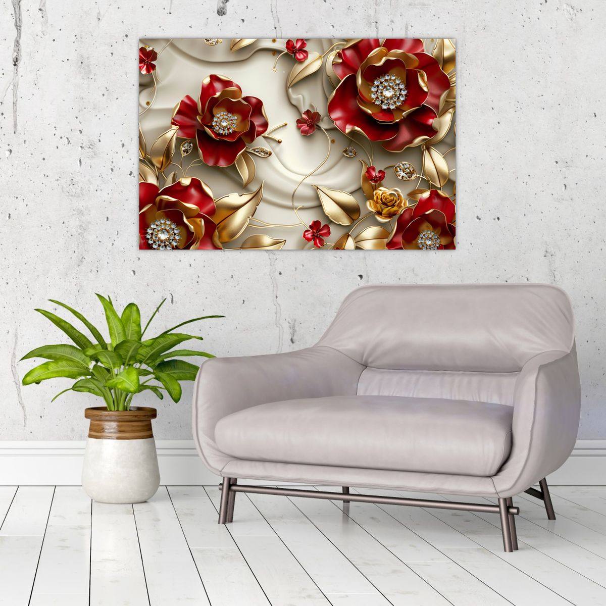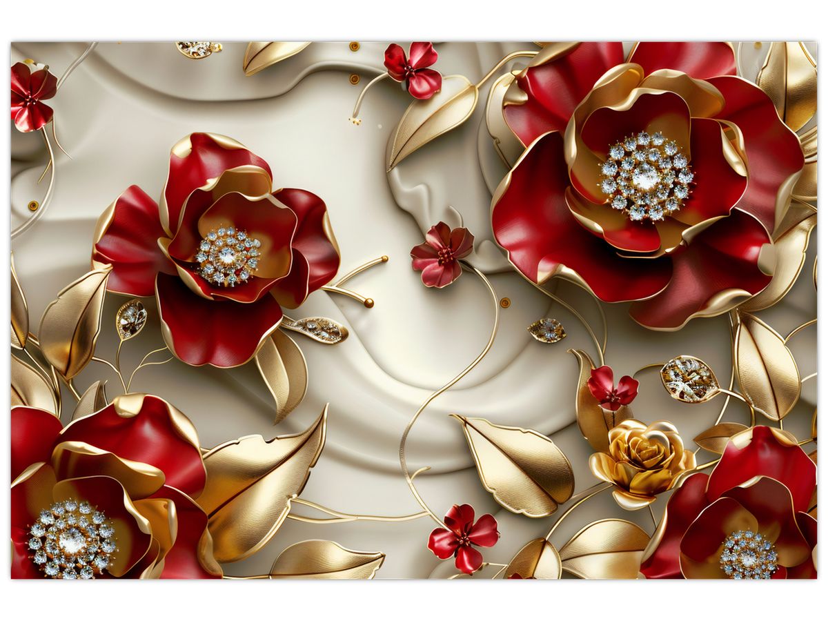 Schilderij - 3D rood-gouden bloemen
