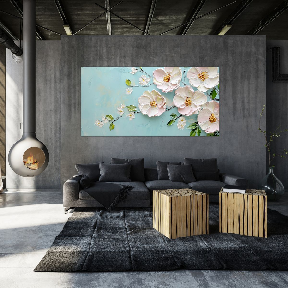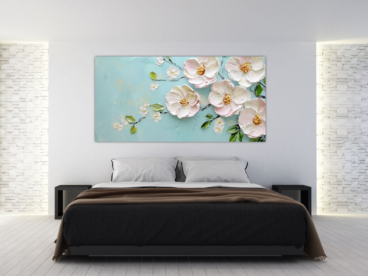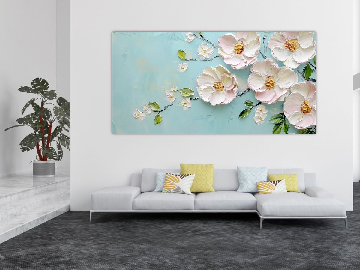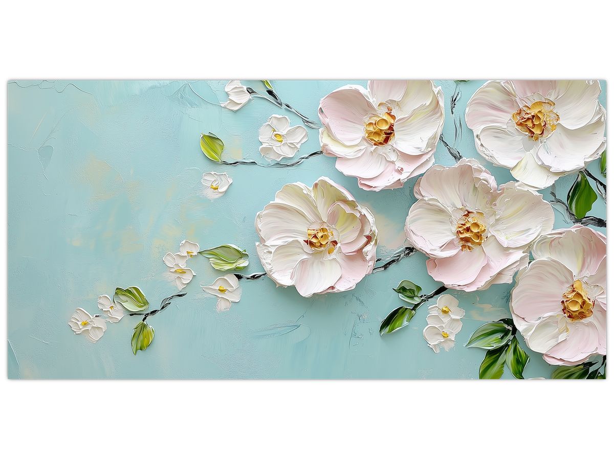 Schilderij - Bloemetjes op blauwe achtergrond